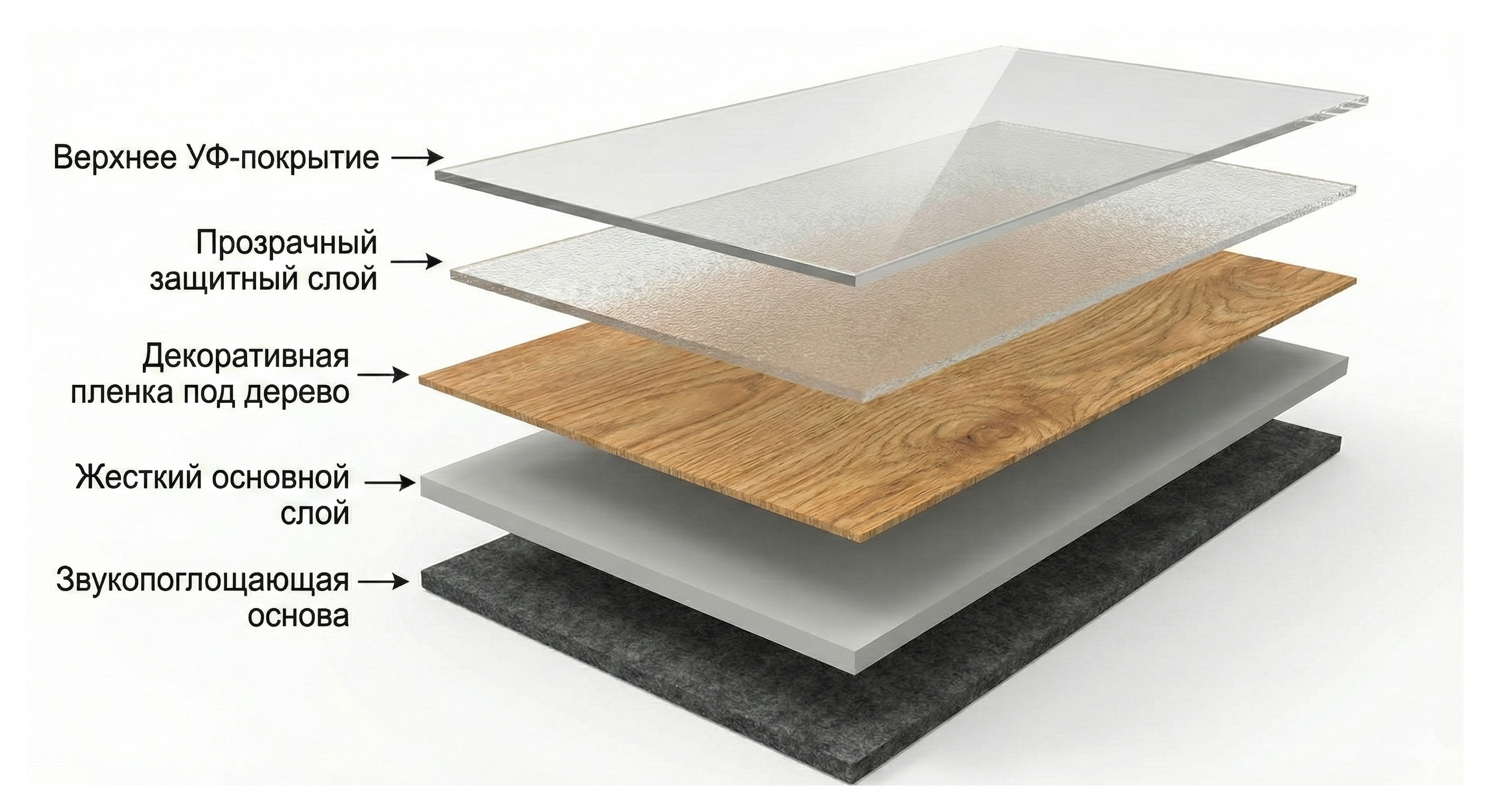 - Декоративный слой (HD-печать): Пленка с высоким разрешением, которая может имитировать любую фактуру: от дубового паркета с сучками и трещинками до мрамора, бетона или даже текстиля.