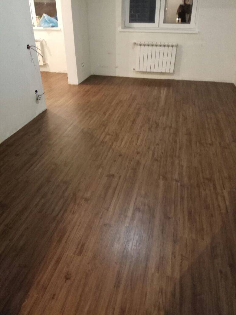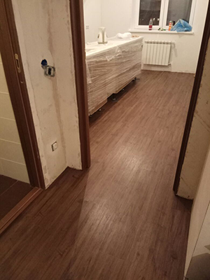 По всей квартире, кроме санузла, пол выложен единым полотном без видимых стыков и порожков. Идеальная работа!