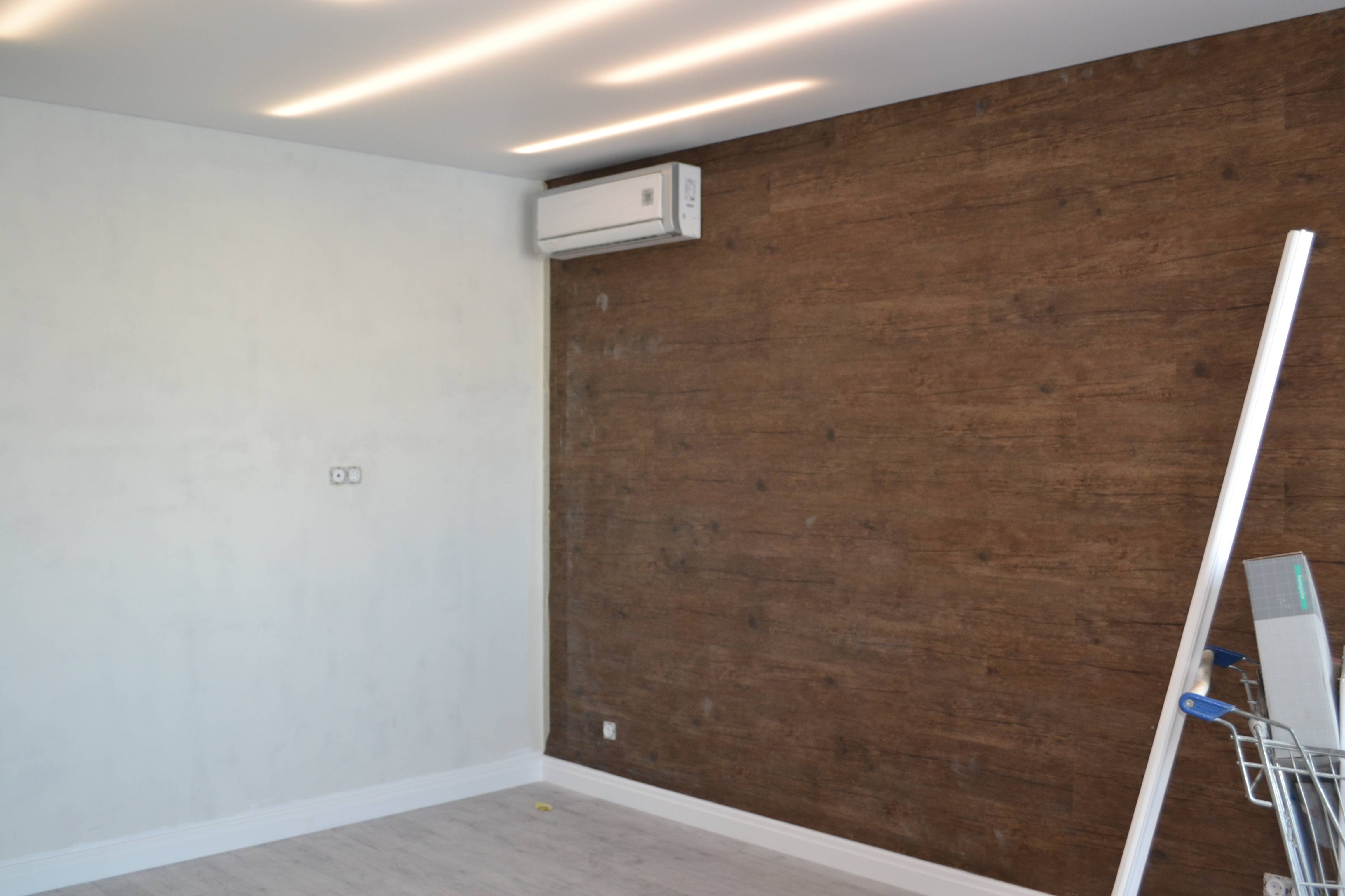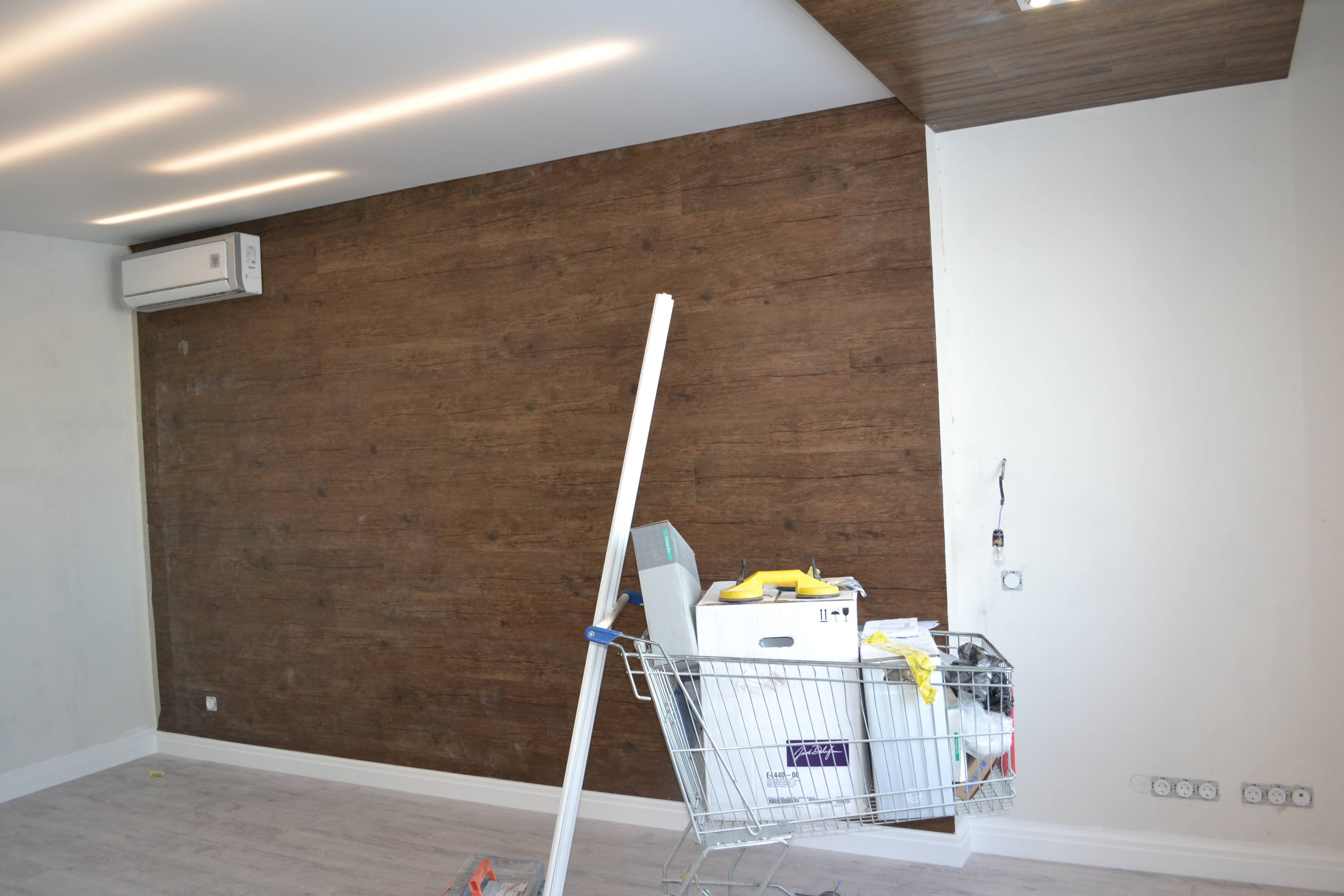 Работа наших мастеров. Укладка кварцвиниловой плитки на стену, пол и потолок. Получилось красиво и необычно. Отличная работа.