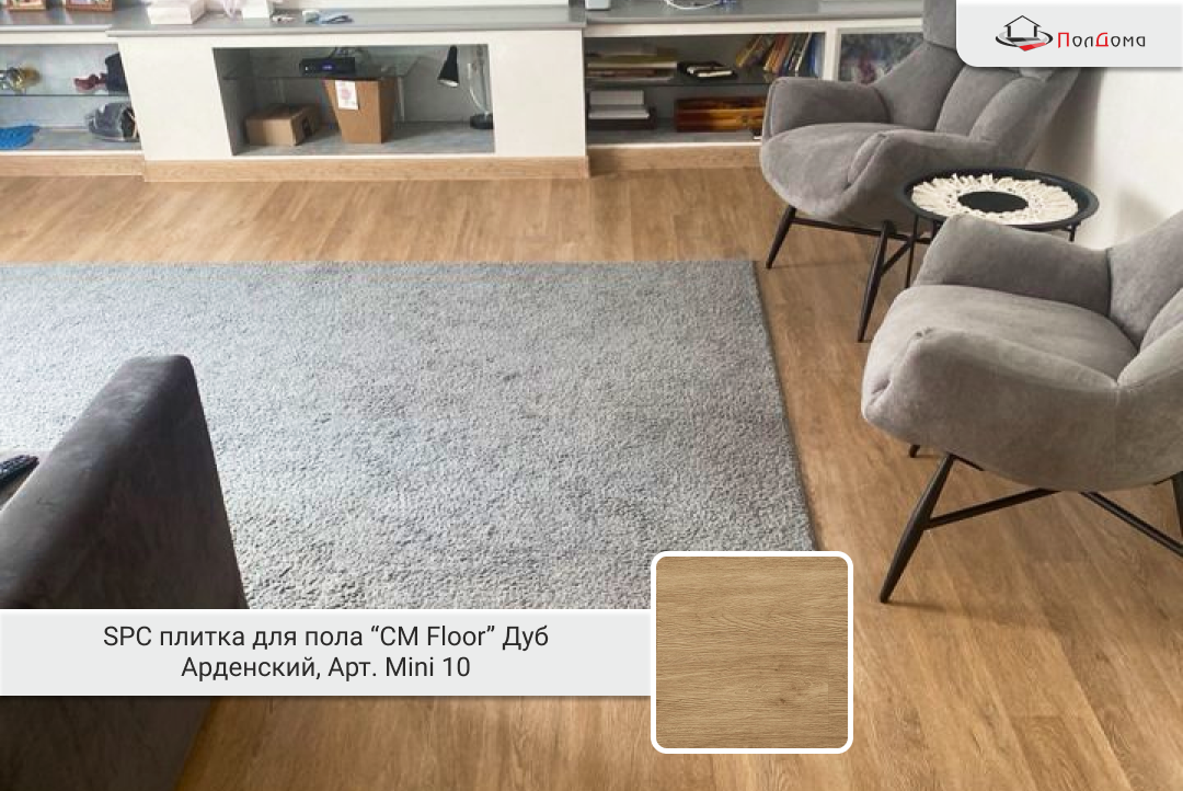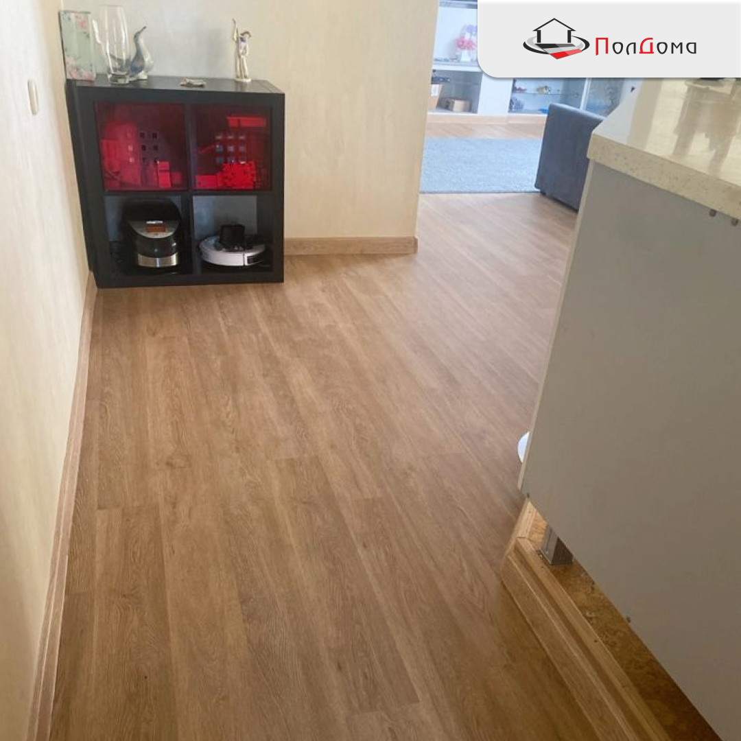 Квартира находится в жилом комплексе с хорошими бетонными перекрытиями, основание — выровненная стяжка, которая не требовала дополнительной подготовки. SPC (каменно-полимерный композит) идеально подходит для таких условий: