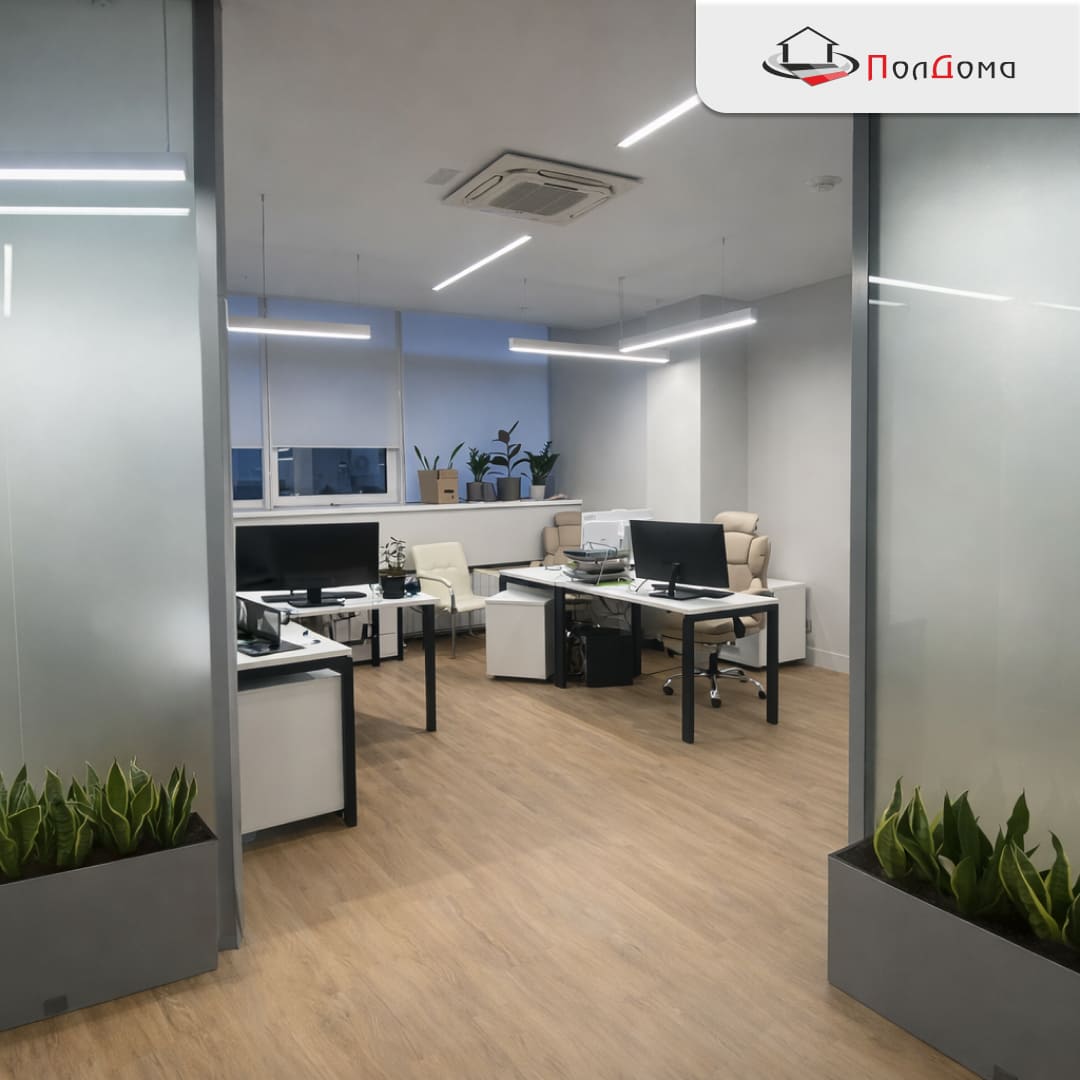 - Термостойкость — покрытие совместимо с системой «тёплый пол», которая часто используется в современных офисах;